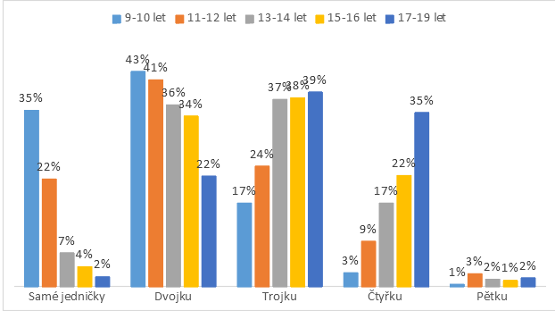 Při hodnocení výsledků průzkumu je nezbytné vzít v úvahu, že prospěch je v průběhu školní docházky velmi proměnlivou kategorií, viz graf 1. Zatímco v kategorii nejmladších dětí (9 až 10 let) uvedlo 35 % respondentů, že na posledním vysvědčení měli samé jedničky, u mládeže ve věku 17 až 19 let jsou to již jen 2 %. Obdobný, ale opačný trend zjišťujeme i u špatných známek. Zatímco známka pět je používána ve všech věkových kategoriích jako něco výjimečného, známku čtyři mělo již 35 % mladých ve věku 17 až 19 let, ale u žáků ve věku 9 až 10 let to byla pouze 2 %. Z tohoto hlediska se potom kategorie pro hodnocení ve starším věku značně zužují, tj. děti, které měly samé jedničky nebo nejhorší známku 2, hodnotíme jako respondenty s výborným prospěchem, a děti, které měly nejhorší známku 4, případně 5, zařazujeme mezi respondenty se špatným prospěchem.