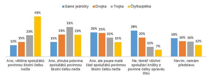 Jedna z otázek směřovala také k tomu, aby respondent vyslovil svůj subjektivní názor na efektivitu povinné školní četby. Otázka byla formulována tak, aby nebyl hodnocen vlastní postoj k povinné četbě, ale aby byl vysloven názor, jak povinnou četbu vnímají spolužáci, viz graf 16. I v tomto případě existují podstatné názorové rozdíly u výborných žáků a žáků se špatným prospěchem. Více než polovina (66 %) žáků se špatným prospěchem se domnívá, že děti ve třídě knížky k povinné školní četbě většinou nečtou a čtenářské deníky nebo referáty připravují většinou na základě informací z internetu nebo jiných zdrojů. U výborných žáků je tento názor spíše menšinový (27 %). Názorové rozdíly a rozdíly v hodnocení lze v tomto případě interpretovat tak, že žáci s horším prospěchem do svého hodnocení promítají svůj vlastní postoj a způsob nakládání s doporučenou či povinnou četbou.