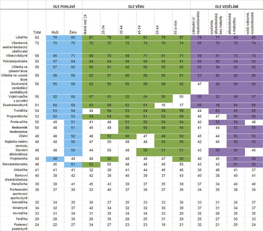 Mezi 27 různými typy profesí se umístili knihovníci a knihovnice na 13. místě – zhruba uprostřed pomyslného žebříčku profesí. Přesné rozložení ukazuje graf 3.