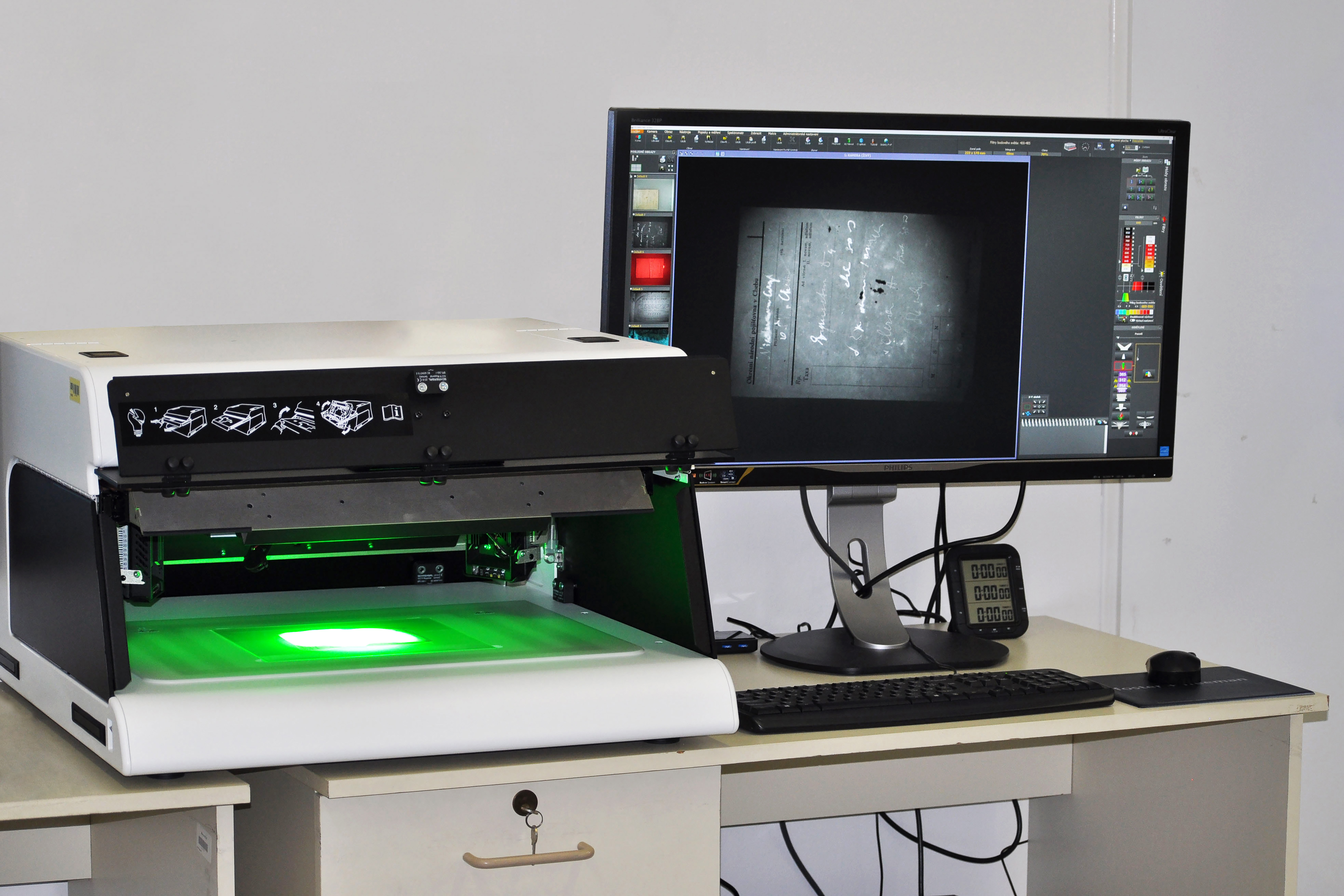 Videospektrální komparátor VSC 8000 (obr. 1) je přístroj, jenž je využíván pro multispektrální analýzu, která spočívá v pozorování dokumentu v široké škále vlnových délek, a to v ultrafialové (UV) oblasti, v oblasti viditelného světla (VIS), ale i v blízké infračervené (IR) oblasti. Zařízení disponuje množstvím světelných zdrojů, jako jsou viditelné/infračervené dopadající i průchozí záření, halogenové bodové osvětlení 20 W ozařující bod o průměru 25 mm, IR/viditelné (levé/pravé) boční ozáření s variabilním úhlem a s 20W halogenovými zdroji a ortogonální ozáření. Bodové záření, které je používáno pro IR luminiscenci, lze kombinovat s dvanácti dlouhovlnnými filtry 430–800 nm nebo s dvanácti krátkovlnnými filtry 380–745 nm. Celkově je možné vybírat až z 80 různých pásem osvětlení. Z opačné strany spektra je zařízení vybaveno ultrafialovými zdroji, s dopadajícím dlouhovlnným UV zářením v pásmu 365 nm, s dopadajícím středněvlnným UV zářením v pásmu 312 nm, s dopadajícím krátkovlnným UV zářením v pásmu 254 nm a s průchozím dlouhovlnným UV zářením v pásmu 365 nm (VSC Hardware 2018).