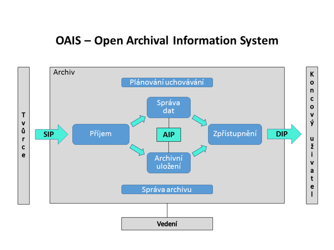 [6] Open Archival Information System (OAIS) is the reference model for long-term digital archive created as an endorsement of an international forum Consultative Committee for Space Data System in 1999 and standardized in 2002 as the International Standard ISO 14721:2003. In 2012 an updated version was published as ISO-14721:2012 (Czech translation of this standard was published in 2014). Highly qualified readable overview and assessment of the OAIS by Brian Lavoie can be found in [6].