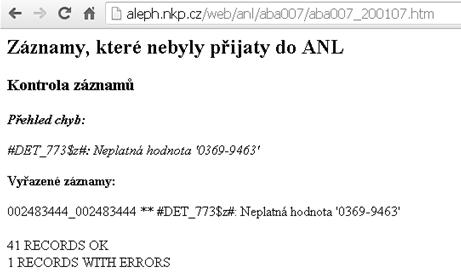 6. Na základě kontrol v etapách 3–5 dostane knihovna, která záznamy zaslala, online protokol obsahující výsledek kontroly. Pokud některé záznamy nebyly přijaty do ANL, je v protokolu uvedeno, z jakého důvodu (viz obrázek 1). Záznamy, které nebyly přijaty, musí zpracovatelská knihovna opravit a znovu do ANL.