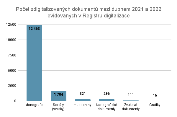 V dokumentu se pracuje s typologií knihovních dokumentů definovaných dle České národní bibliografie (ČNB).4 Členění je následující: knihy, pokračující zdroje, grafiky, hudebniny, zvukové záznamy, kartografické dokumenty a videodokumenty. Digitalizující instituce se zpravidla zaměřují na ty nejběžnější typy dokumentů, tedy knihy (dle sledovaných údajů v Registru digitalizace jich bylo mezi dubnem 2021–2022 evidováno 12 463) a pokračující zdroje (1 704 svazků),5 méně pak na hudebniny (321 titulů), mapy (296 titulů) a zvukové dokumenty (111 titulů), nejméně se digitalizují grafiky (16).