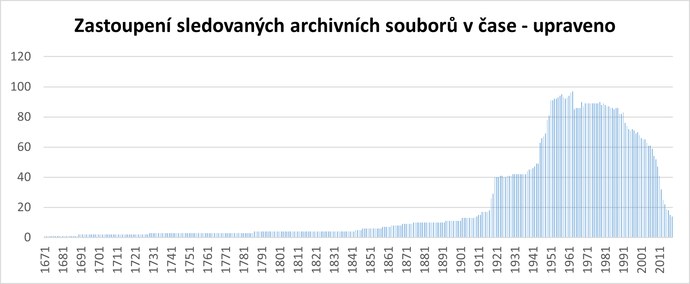Časový rozsah sledovaných archivních souborů odpovídal záměru, tj. jednalo se o fondy obsahující osobní a citlivé osobní údaje žijících osob, jak ukazuje následující obrázek.