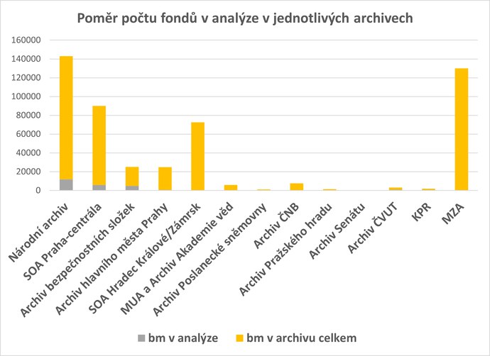 Obr.1 Graf znázorňující množství sledovaných fondů v poměru k celkovému počtu archivních souborů v jednotlivých archivech